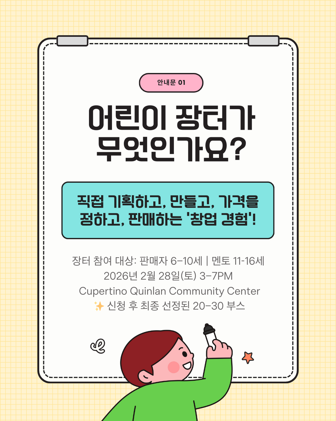 기업가정신 (청소년 대상 온라인) | 2026.2.7 토요일 9PM <어린이 장터 멘토링 코칭II> by 한인 스타트업 창업가 (TBA) 자세히보기 및 신청하기