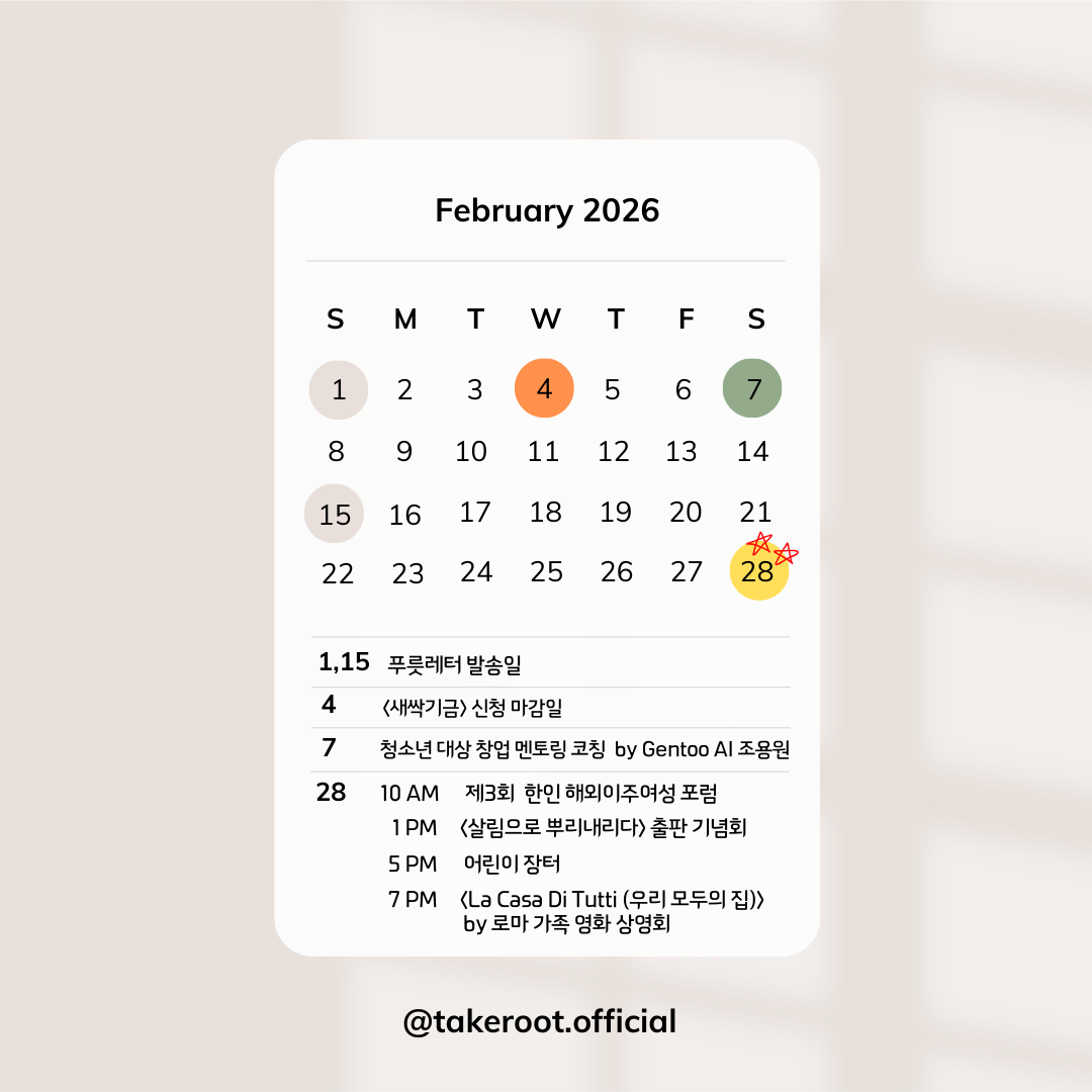 테이크루트의 출판 프로젝트 <살림으로 뿌리내리다>의 일부 내용이 미주 한국일보의 특집 기사로 편집되어 매주 금요일 찾아갑니다. 지난 2025년 12월 12일 금요일 칼럼을 공유합니다. 앞으로도 많은 관심 부탁드립니다.