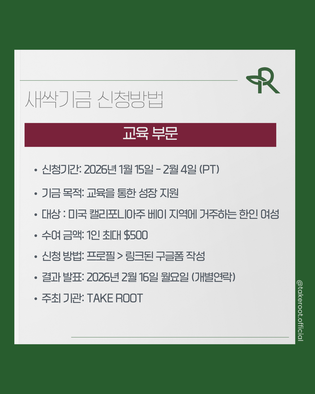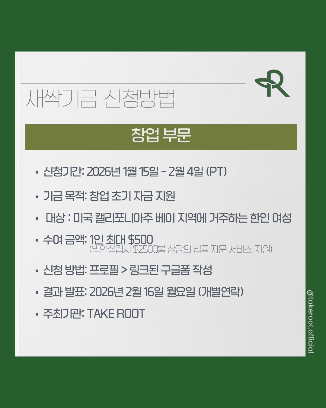 테이크루트의 미션과 결을 같이 하면서 성장을 꿈꾸는 푸릇님들이 계시다면 주저하지 말고 저희에게 알려주세요! 당신의 시작을 응원하며 새싹기금 최대 $500을 전합니다.